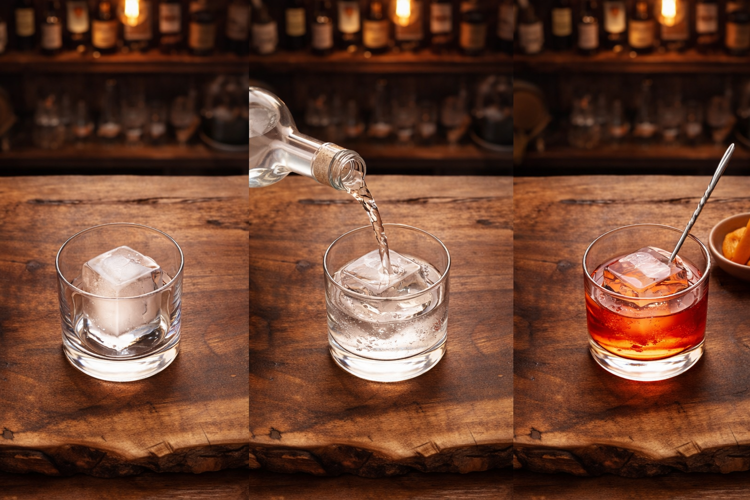 Simple spirit-forward drinks with minimal ingredients can often be built in the glass if they don't require precise dilution. A Negroni can be built by pouring equal parts gin, Campari, and sweet vermouth over a large ice cube and stirring briefly. Some bartenders prefer this to a fully integrated stirred version because the drink continues evolving as you sip it.