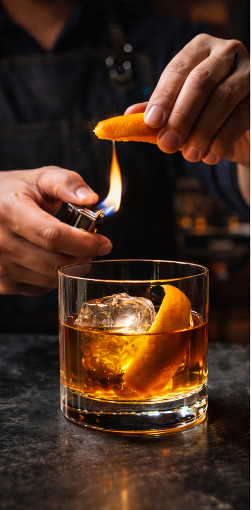 This technique works best on spirit-forward cocktails served in rocks glasses where you can safely flame without risk. Old Fashioneds are the classic application—an orange peel flamed over the drink adds complexity that complements the whiskey. Avoid flaming over cocktails served up in coupes or Martini glasses since the flame is harder to control and you risk scorching the rim.